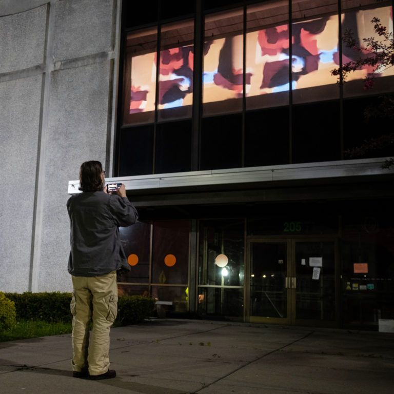 “Threads of Light” is a collaboration between Skaneateles artist Lorne Covington and contemporary textile artist Gerri Spilka. Covington, who creates interactive artwork and installations as Noirflux, manipulated images of Spilka’s large-scale art quilts by adding movement. The resulting work was a changing textile of pattern and light.