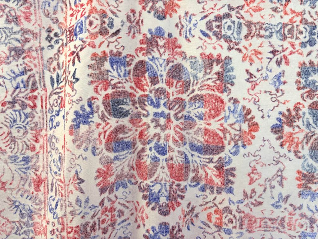 The coverlet depicts a floral motif resembling a planned and walled garden, comforting in its ornate symmetry. Edenic verdure woven with red, white, and blue thread. I’m intrigued by the tensions embedded in this object’s beauty and the exploitative conditions surrounding its production. It is a distinctly American object woven in a city known both for its role in the movement to abolish slavery, and its perpetuation of slavery in its contemporary iteration – the prison industrial complex.