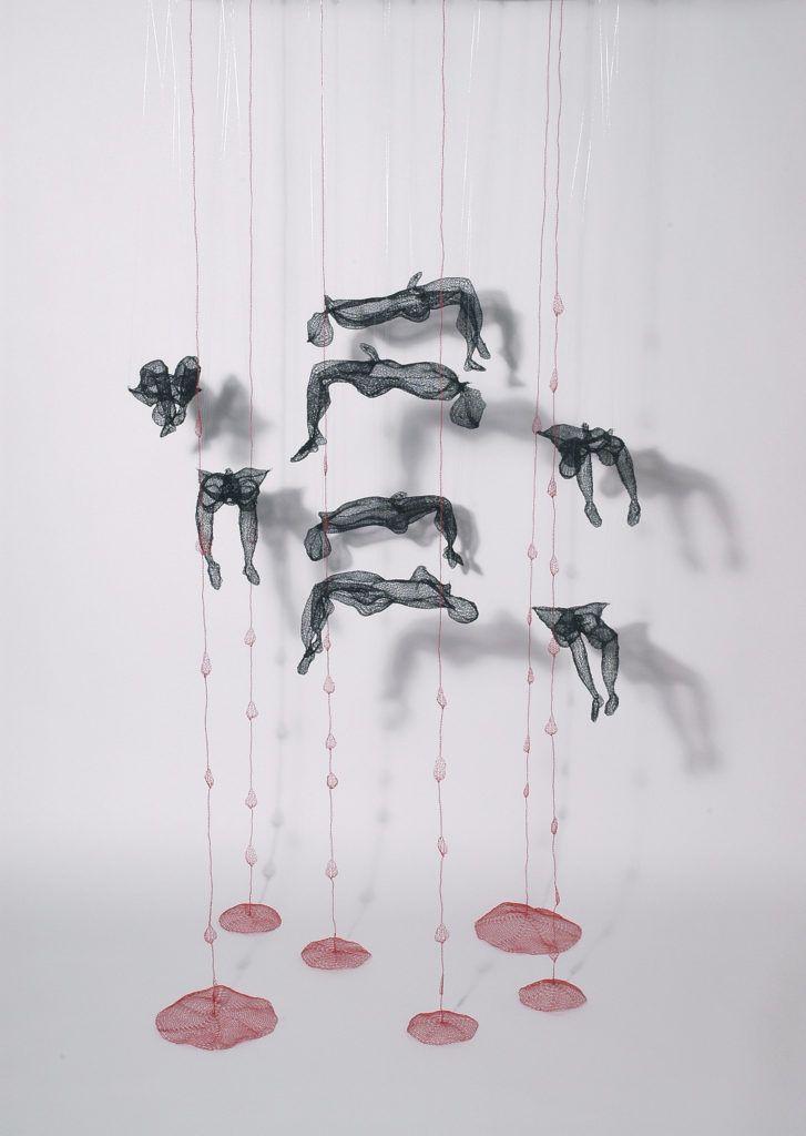 Hanging from the ceiling are several supine male and female figures, with blood-red crocheted wire forms falling down into a circle underneath. The figures move with the slight breeze as visitors pass it, adding to its impact. There’s no mistaking the strong anti-war message that Sloane’s work invokes – her goal in creating it.