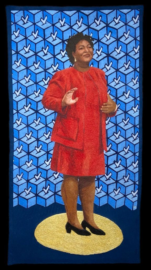 Recently acquired knowledge led Katherine McClelland, of West Springfield, MA, to create “Stacey Abrams,” a felted portrait of the Georgia politician, author, and voting rights activist. McClelland became aware of Abrams in 2018 when she lost her race for Georgia’s governorship.