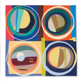 Curator Nancy Crow challenged the participating artists to create a unique design based upon the Bull’s Eye pattern: four circles comprised of concentric rings (the iconic target symbol), set in a grid of four blocks, or quadrants. The quilts have been conceived in improvisation, in building upon or breaking down an established pattern into something new and individually expressive.