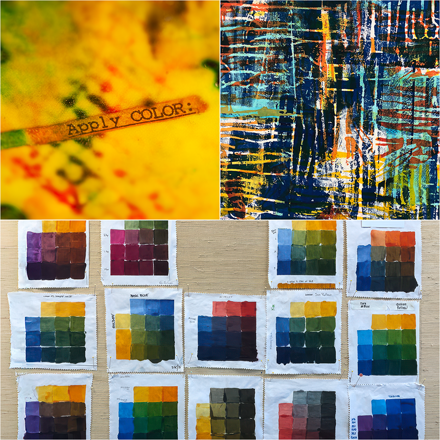For the first three days day we will focus on one type of palette to swatch — bright, earthy, neutral — followed by surface design play using stencils, silkscreens, gelli plate printing, and more. Discussions of temperature and color bias in each primary dye will lead to more informed color choices when combining dyes.