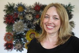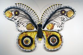 Michelle Stitzlein creates found object art/sculpture from recycled materials, including piano keys, broken china, license plates, rusty tin cans, electrical wire, bottle caps and plastic bags. “I have a strong desire to create. To make ‘something with nothing’ that nobody else wanted,” says Stitzlein. Her Industrial Nature show is composed of work from The Fynbos Series, the Lichen Series and the Moth Series.