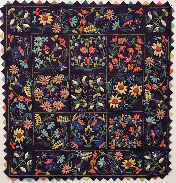 Christine Wickert is a mainly self taught traditional quilt artist. She has been quilting since the 1980’s and is an active member of the Genesee Valley Quilt Club in Rochester, NY. Her many prizes include three Best of Shows at the Vermont Quilt Festival (2012, 2014, 2016), one Best of Show at AQS Lancaster (2013), one Best of Show at Pennsylvania Quilt Extravaganza (2023) and two Best Wall Hand Workmanship at AQS Paducah (2019, 2023). Her silk quilts were part of three special exhibits at the New England Quilt Museum (2013, 2017, 2019). She has conducted a quilt residency with elementary school children in the Webster NY School District under the auspices of Young Audiences of Rochester (2001), given trunk shows of her quilts at various venues in New York State and Massachusetts, and teaches silk appliqué workshops across the country. Her traditional quilts are often adaptations of designs by well known quilt artists. Hand appliqué and hand quilting continue to be her favorite techniques and indeed define her style. Christine lives in Rochester, NY.