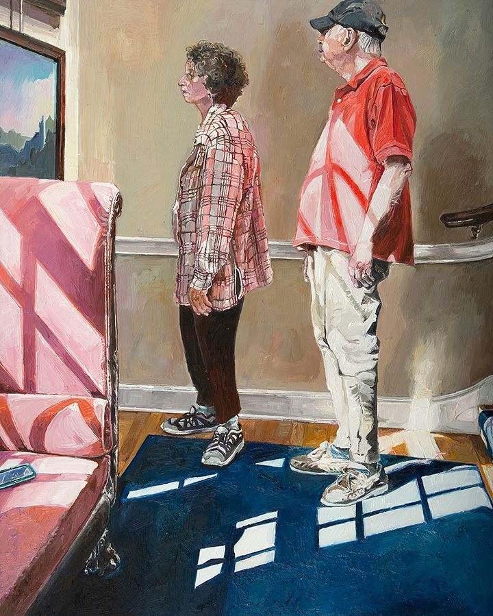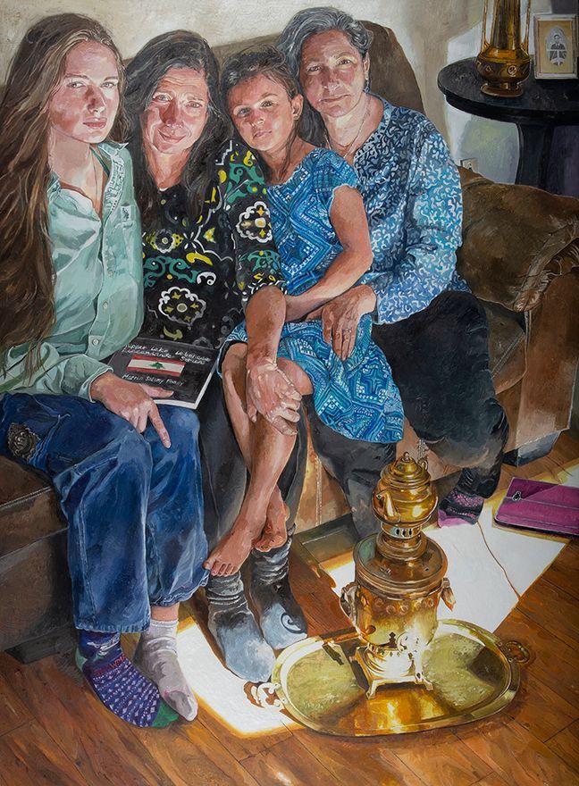 An example: A painting of her father sitting on a couch, his hands signaling that he’s making a point during an intense conversation. The title: “Just vote – but not against your own interests.” “This image was made a week before he died,” Hoffer said. “He told me that people in poor rural areas continually vote against their own interests, and that he hoped they ‘smartened up.’”