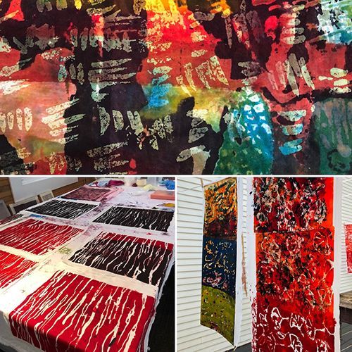 To develop the vision, we will brush and screen, mask, spray, and monoprint onto white pfd OR previously dyed, patched, and stitched cloth, using any or all of the following:
