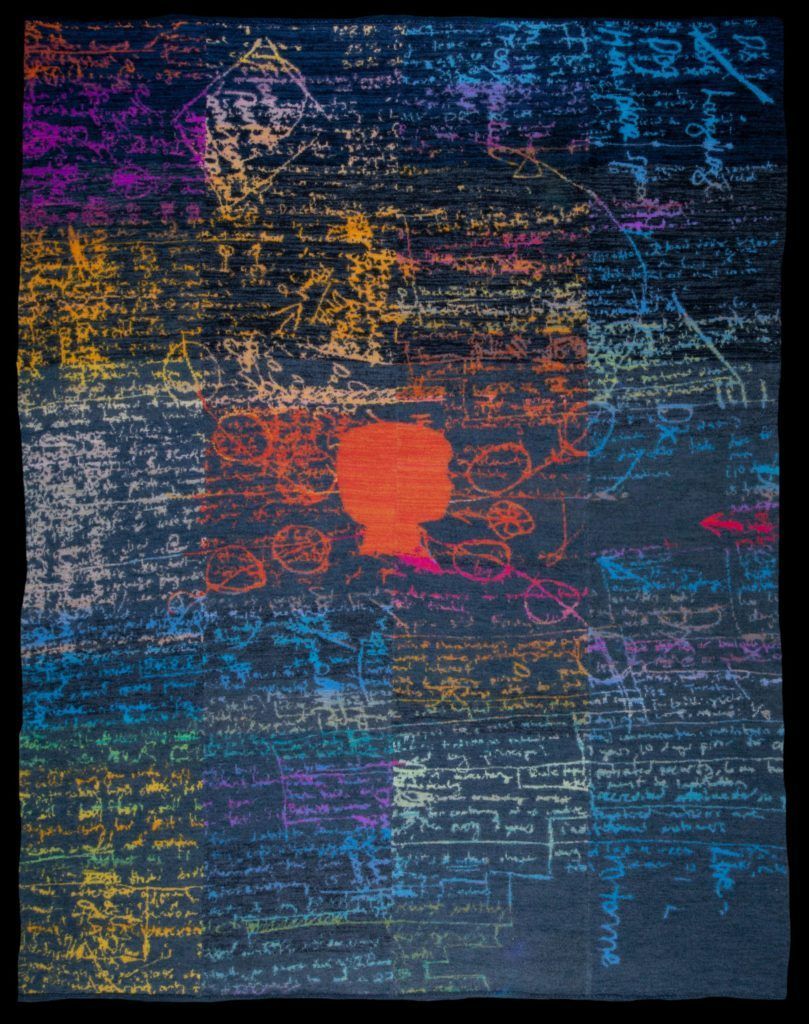 Her current work is “History Lessons,” a series of large-scale rugs that she knits in sections that are sew together by hand and then processed in her washing machine. Pieces from Clarke’s “Portal” and “Forms” series will also be on display.