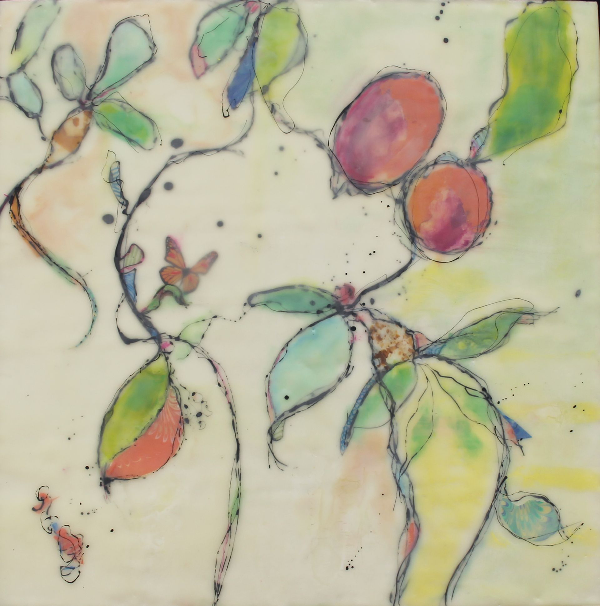 Because wax is a wonderful adhesive, artists can embed nearly anything in the work, making it a perfect medium for mixed media collages. The wax can also be scraped and incised to show lower layers; stamped and stenciled; and embellished with gold leaf and pan pastels. Artists can also write on the piece with an ink-filled stylus.