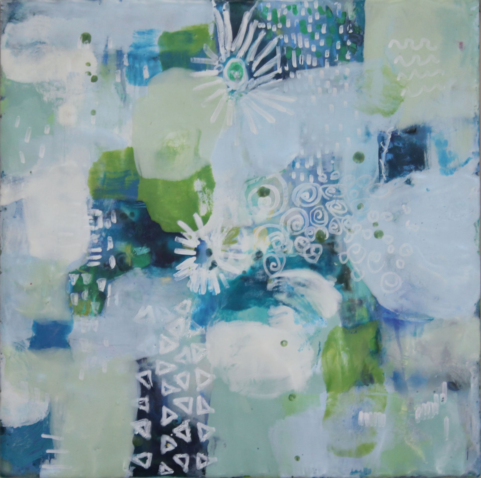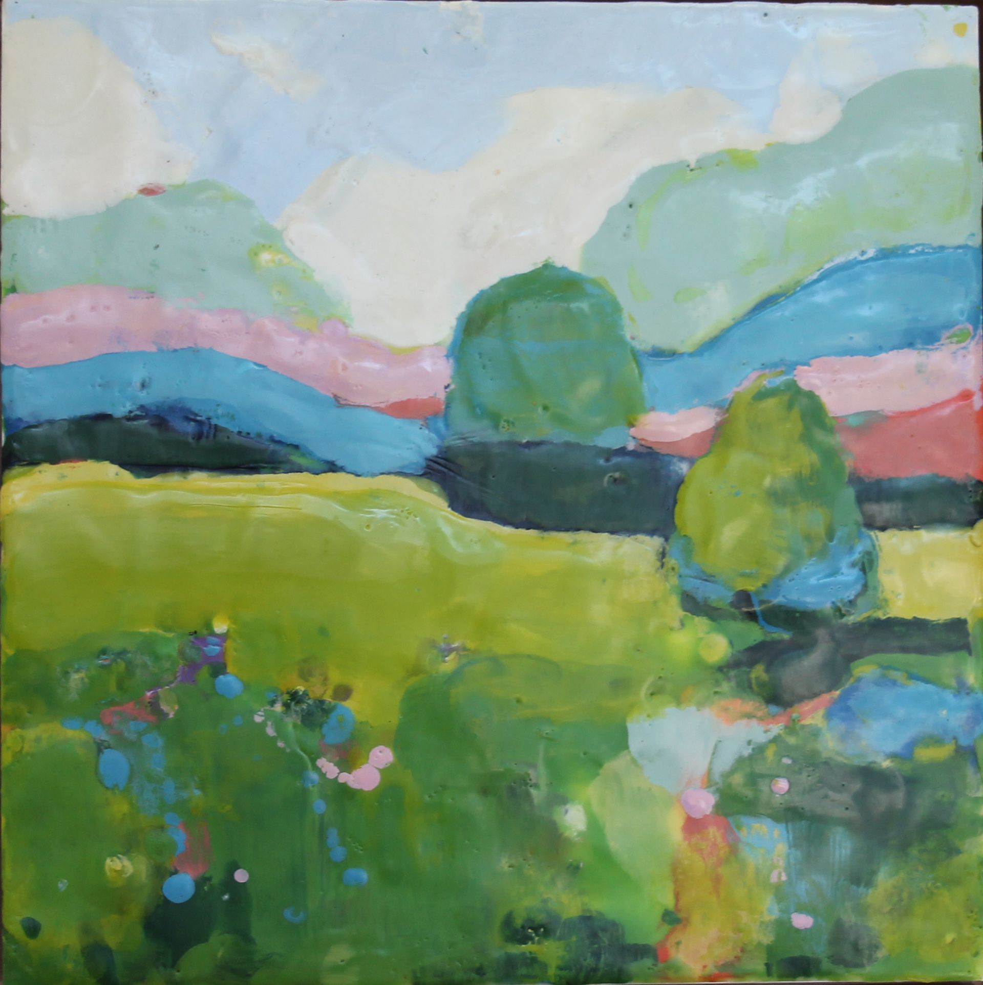 "Field" and "Pathway" are wax homages to Hootnick’s previous time painting plein air landscapes. “I still love landscapes, but I’m not looking for detail or photorealism in my newer pieces,” she said. “I’m interested in the space between realism and abstraction, so I used color fields and flat shapes to represent the scene.”