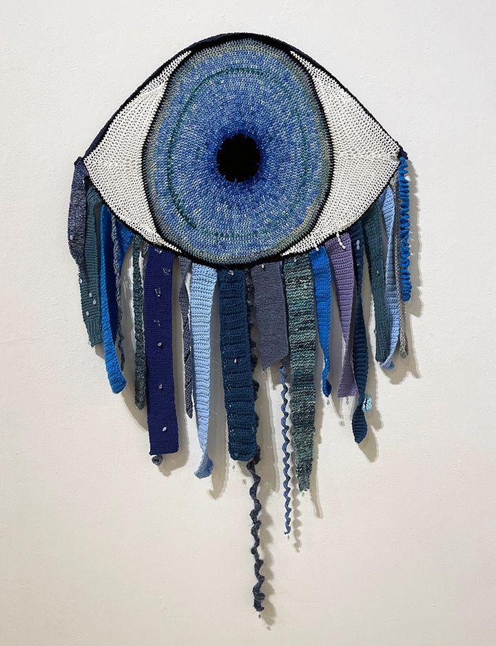 The piece, called “Earth’s Eye View,” is a giant crocheted eye with dangling streamers festooned with clear or white beads – perhaps representing tears as Earth watches the destruction wrought by wars and climate change.