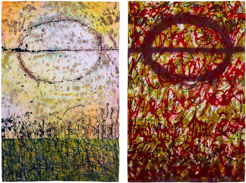 In the last four years Schulz has begun to explore acrylic and mixed media on paper. These efforts grew out of a frustration with the limits of working with cloth and a sewing machine to make marks. Each media influences the other as she works back and forth, sometimes merging the two worlds.