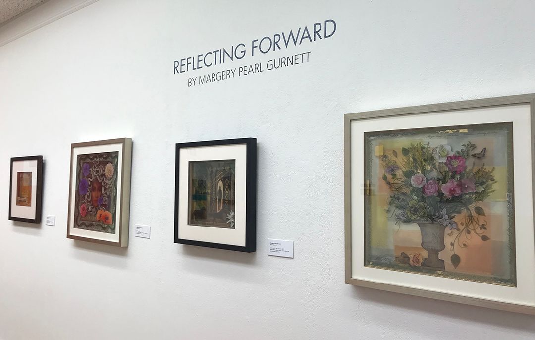She especially loved that ice because, while almost invisible, it managed to capture any twigs, leaves, and insects that were laying on top when it froze. “I imagined whole snow globe worlds in the still glassiness, a borrowed moment captured forever, recorded temporarily in the ice,” she said. In many ways, that’s what Gurnett’s current artwork, on display at the Schweinfurth Art Center from Sept. 1 through Oct. 14, 2018, captures as well. The solo exhibition, “Reflecting Forward,” features her 3D mixed media wall pieces made with glass, paper, paint, and found objects suspended in resin.
