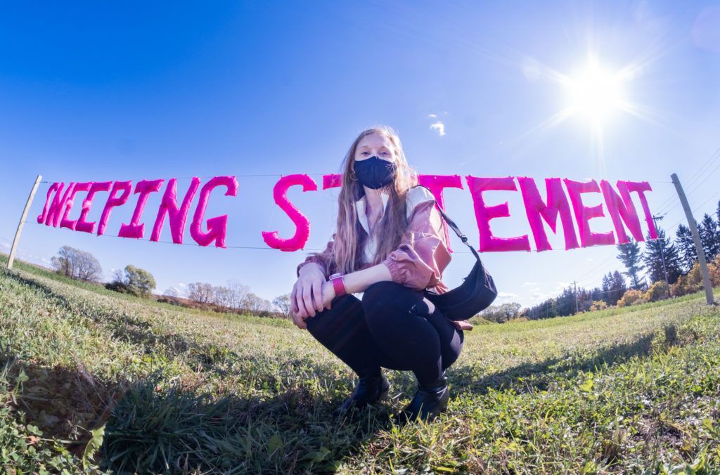 Warfield’s piece consists of letters made of water-resistant nylon with an additional layer of water resistant coating and stuffed with Poly-fil that spell out sweeping statement. The letters are suspended on cables between posts, allowing them to seemingly float. “It’s not intended to exist forever outdoors, but it was certainly made with Upstate New York’s ever changing weather at the forefront of my mind,” she said.