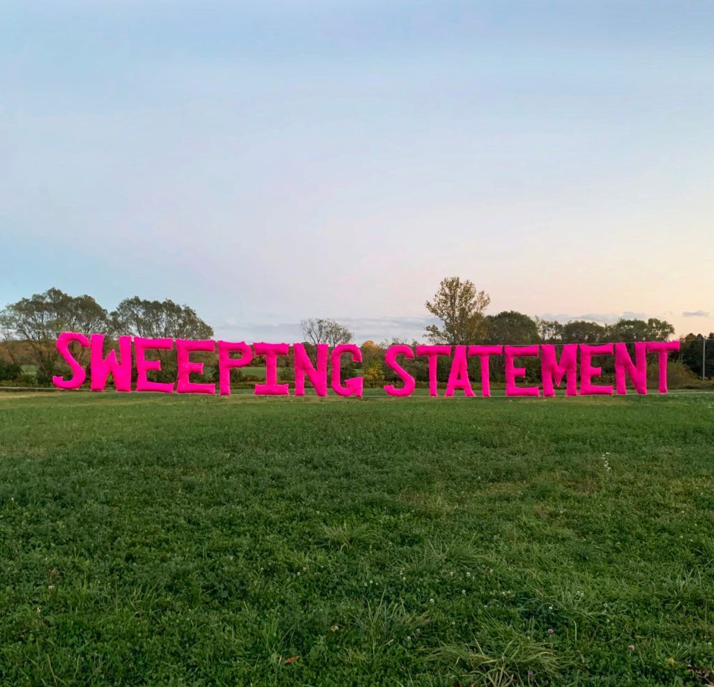 Set against the Upstate New York landscape, Sweeping Statement is an eye-catching, 35-foot textile-based sculpture on view at the corner of East Lake Road and Pork Street in Skaneateles, NY. The text is self reflexive, a succinct concrete poem whose meaning is accentuated by its form.