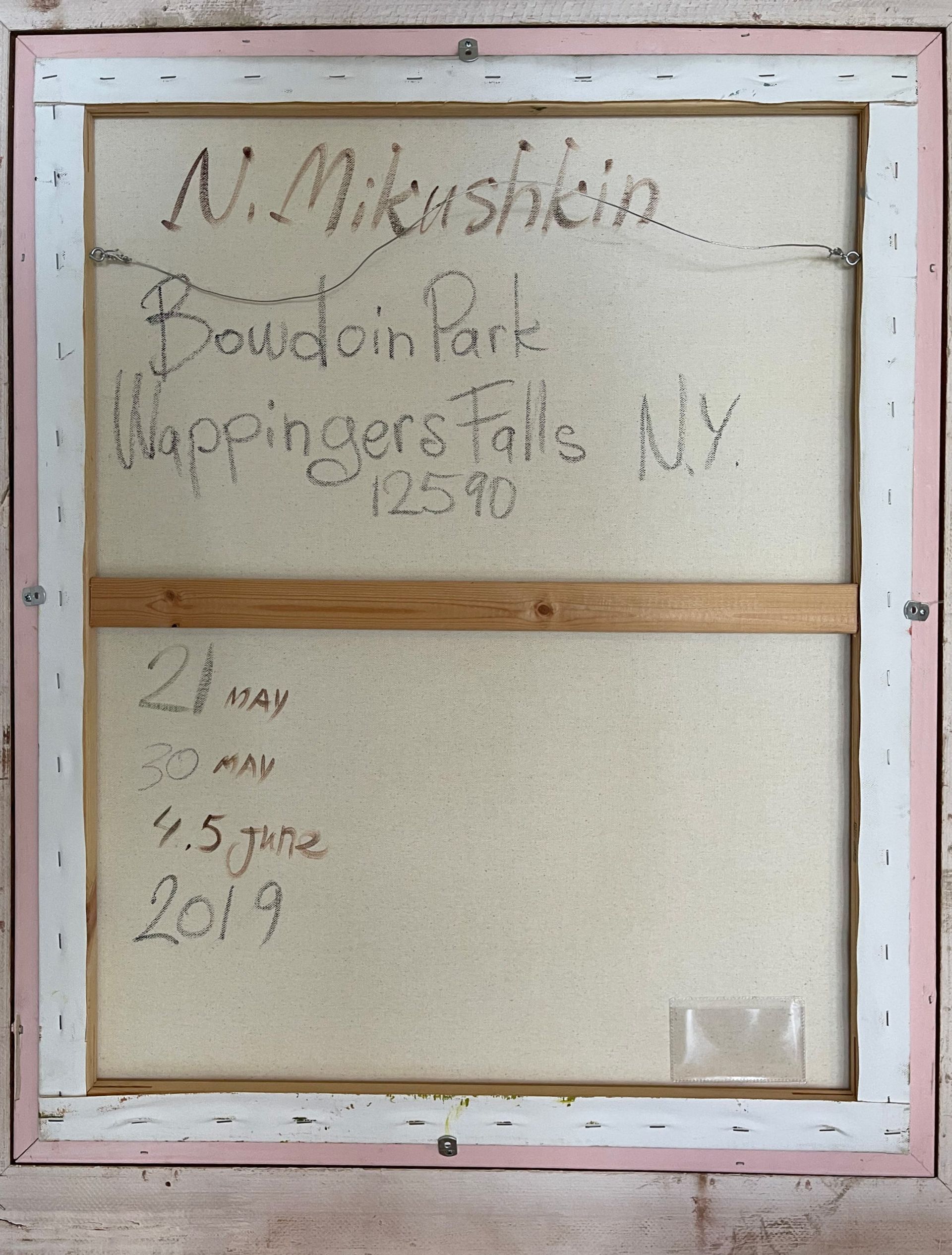 Since his oil paintings are so large, 40 by 52 inches, it takes several 3-hour sessions to complete one piece. He keeps track by painting the dates he worked on the back of each piece. For instance, the back of “Evening in Bowdoin Park” lists four dates: May 21 and 30 and June 4 and 5, 2019.