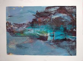 “My process is improvisational,” explains Frutiger, “I work in layers; usually beginning with paint scraped across the paper, followed by random marks, collage and more paint. Obliteration, dissolution, and uncovering are important parts of my process. I am particularly attracted to hand writing, distressed paper and my own photographs of obsolete objects and industrial decay. It is interesting to me to see what emerges in the final piece; echoes of other voices and concerns, forgotten landscapes, and subtle reminders of our industrial past.”