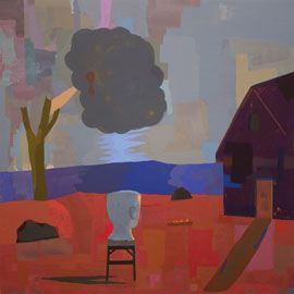 Working in the media of both painting and cyanotype, David Hornung creates intuitively by making connections between abstract shapes and defined subject matter. His images are reminiscient of storybook pages, depicting flattened but luminous subjects such as walls, ladders, rocks, trees, ropes, bones, and rickety tables. His use of color is a unifying force- pulling disparate objects together on a subconscious picture plane. Hornung states, “My process involves getting lost in irresolution and then finding my way through many adjustments as the painting develops. Whenever possible I allow my unconscious mind free play throughout the painting. I’m always on the lookout for the unexpected. This approach allows fluid interrelationships between color, shape and symbol in a way that, I hope, communicates my abiding sense of the equivocalness of existence.”