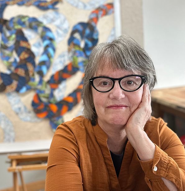 At the Schweinfurth Art Center, Stetson’s recent mixed-media works are influenced by fluid dynamics; the study of the winding and spiraling movement of water. The Nomadic River is a cartographic fabric collage that traces the Mississippi River’s meander belt, based on a detailed map of historic Mississippi riverbeds made in the 1940s. The mixed media pieces take the motif of a braided rug, but animate the braids. They separate, becoming unwoven, entangled or knotted, and snake around in the space. Each braid weaves together images from the natural world in combination with scraps and bits of fabric and ephemera from Stetson’s collections. This work seems to mirror the way one makes sense of a life- memories are combined until a pattern starts to emerge, only to have events take us in unexpected directions, unplanned and untamed.