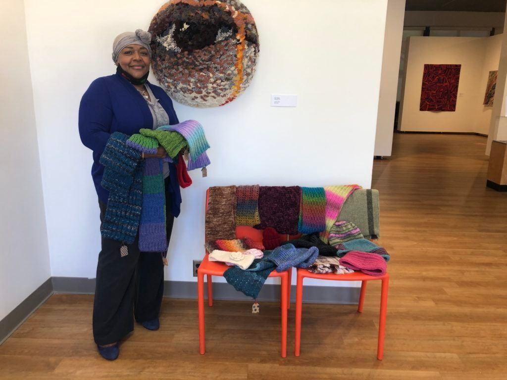 The distribution capped a joint effort by Johnson, who lives in Weedsport, and a group of knitters connected to the Schweinfurth Art Center to make more than 100 hats, scarves, shawls, and gloves since early September. Johnson, who owns the for-profit company Divine Coverings, and independent consultant LeeAnn Slomski bedazzled about 60 items over the weekend.